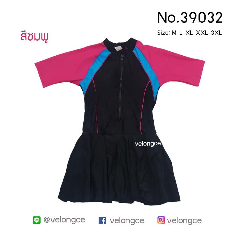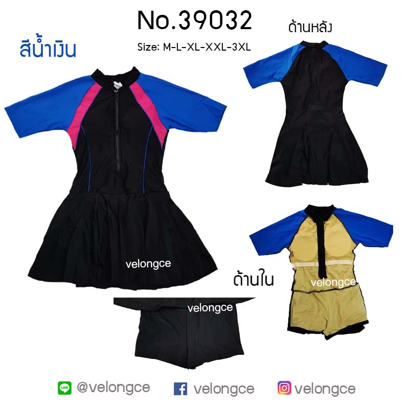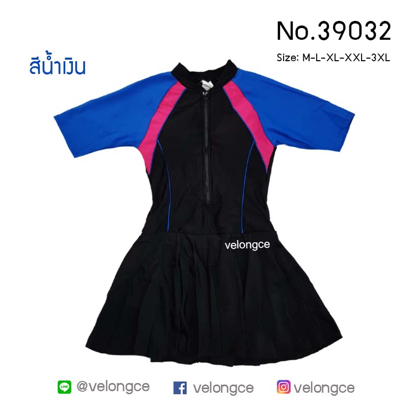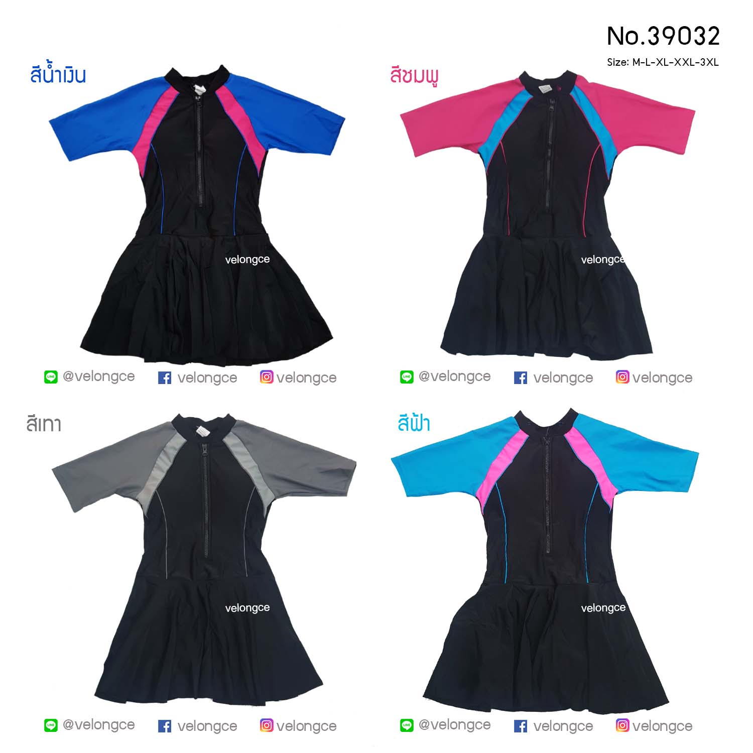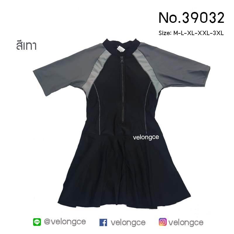 รุ่น 39032 ชุดว่ายน้ำผู้ใหญ่ชิ้นเดียวแขนสั้น กระโปรง size M-L-XL-XXL-3XL