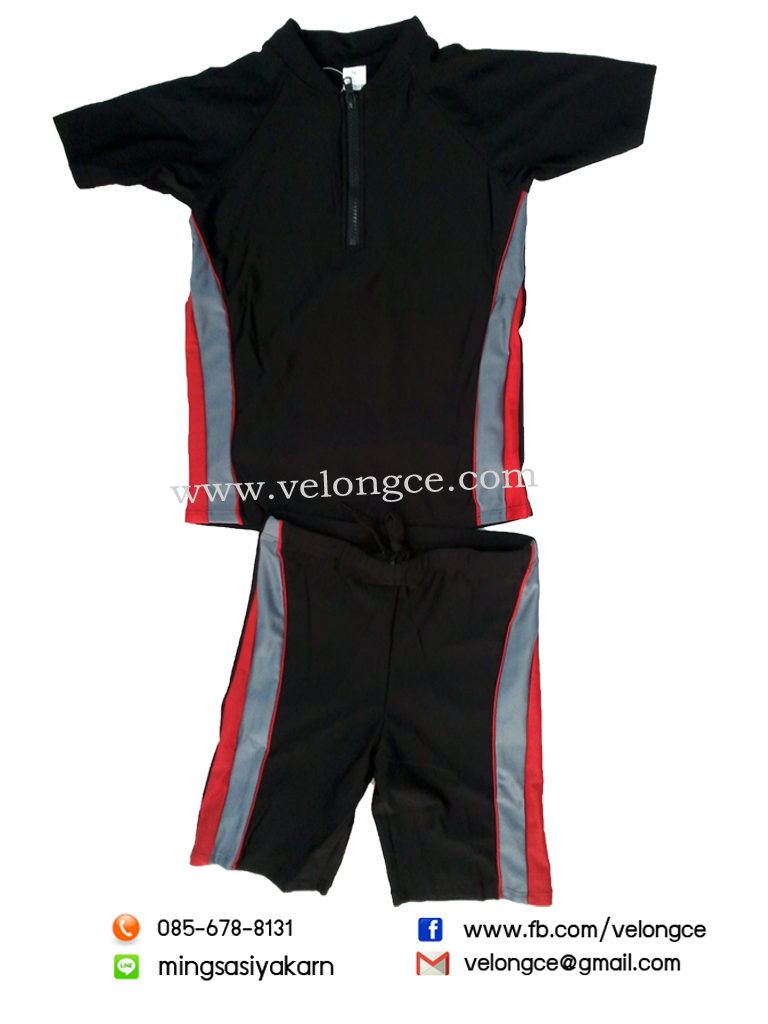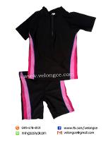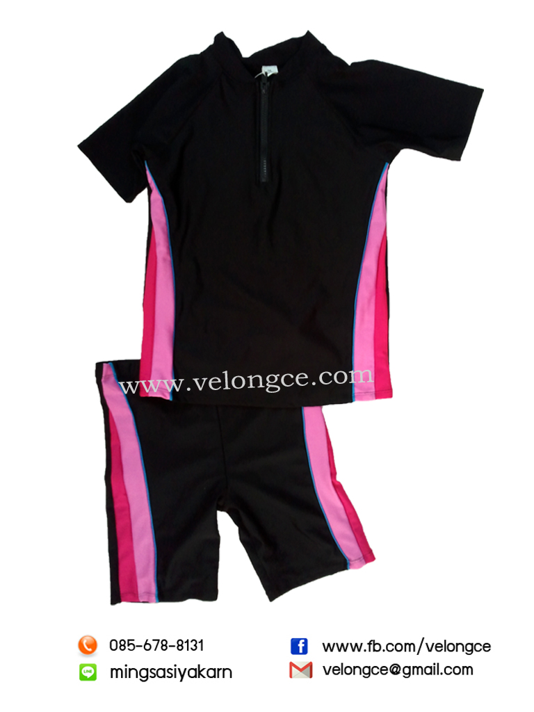 ชุดว่ายน้ำเด็ก 2 ชิ้น แขนสั้นขาสั้น มีซิปหน้าใส่ง่าย เสื้อและกาเกงพื้นสีดำ มีแถบสี