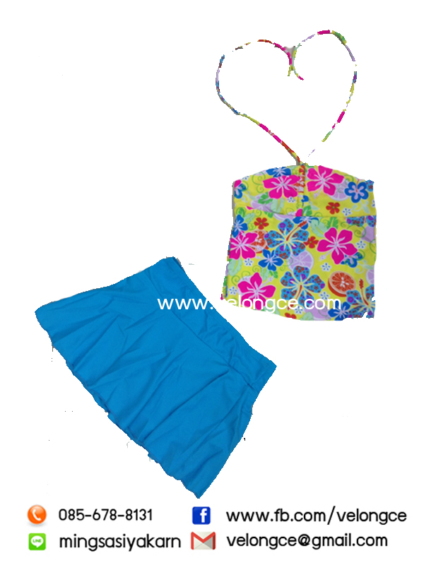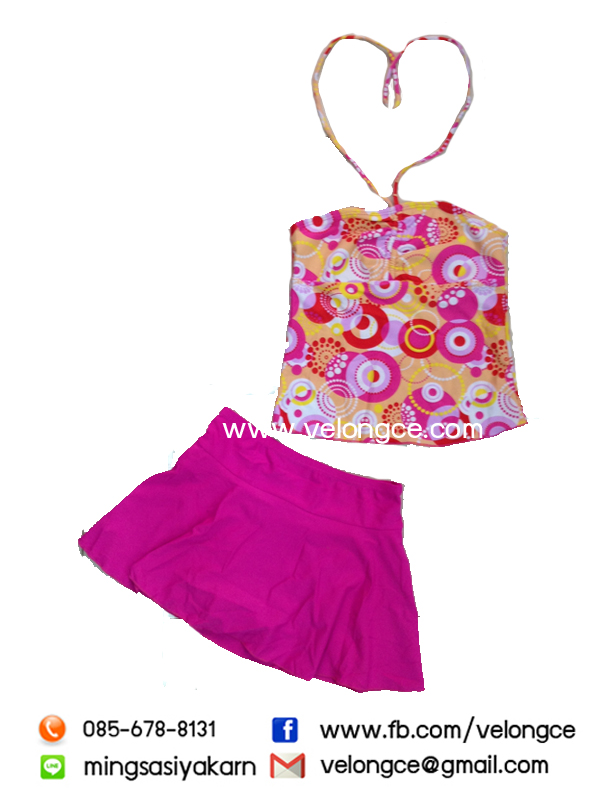 No. 250 ชุดว่ายน้ำเด็กเสื้อเกาะอกผูกคอลายคู่กระโปรงสีพื้น Size S-M-L-XL