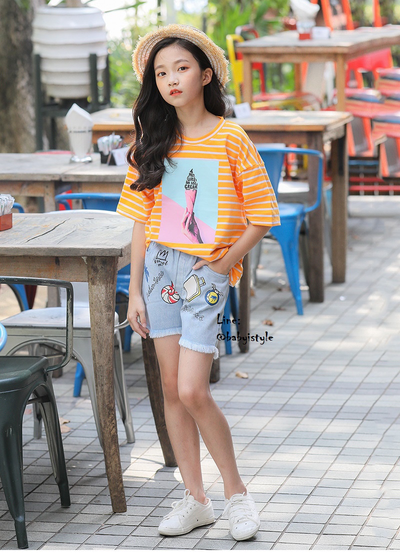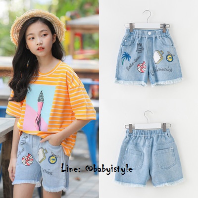 เด็กโต-กางเกงยีนส์ฟอกขาสั้นสกรีนกระเป๋าและเปลือกหอย(ไม่รวมเสื้อ)ไซส์ 140/160 รหัส KKL053