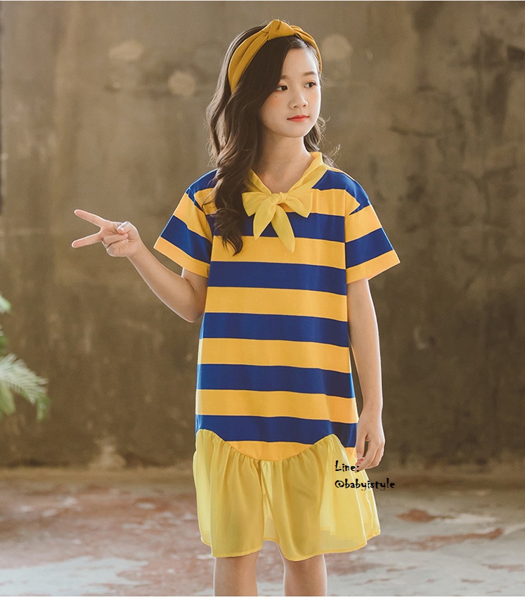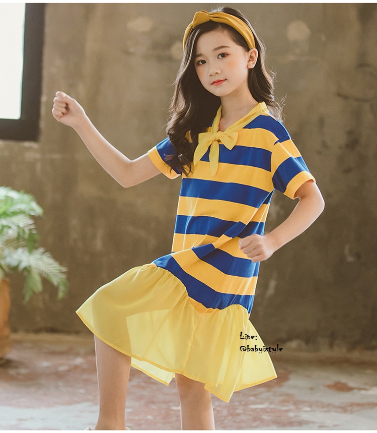 เด็กโต-เดรสแขนสั้นลายริ้วสีเหลือง-น้ำเงินผูกริบบิ้นชีฟองและชายต่อระบาย ผ้าดี สวยเก๋ ไซส์ 140/150/160/170