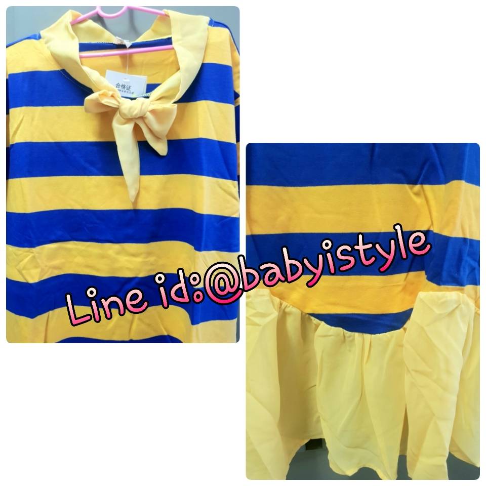 เด็กโต-เดรสแขนสั้นลายริ้วสีเหลือง-น้ำเงินผูกริบบิ้นชีฟองและชายต่อระบาย ผ้าดี สวยเก๋