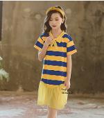 เด็กโต-เดรสแขนสั้นลายริ้วสีเหลือง-น้ำเงินผูกริบบิ้นชีฟองและชายต่อระบายไซส์ 150 รหัสKKL067A