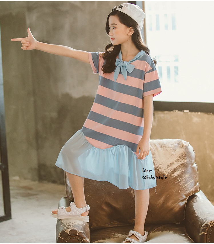 เด็กโต-เดรสแขนสั้นลายริ้วสีเทา-ชมพูผูกริบบิ้นชีฟองและชายต่อระบาย ผ้าดี สวยเก๋ ไซส์ 140/150/160/170