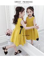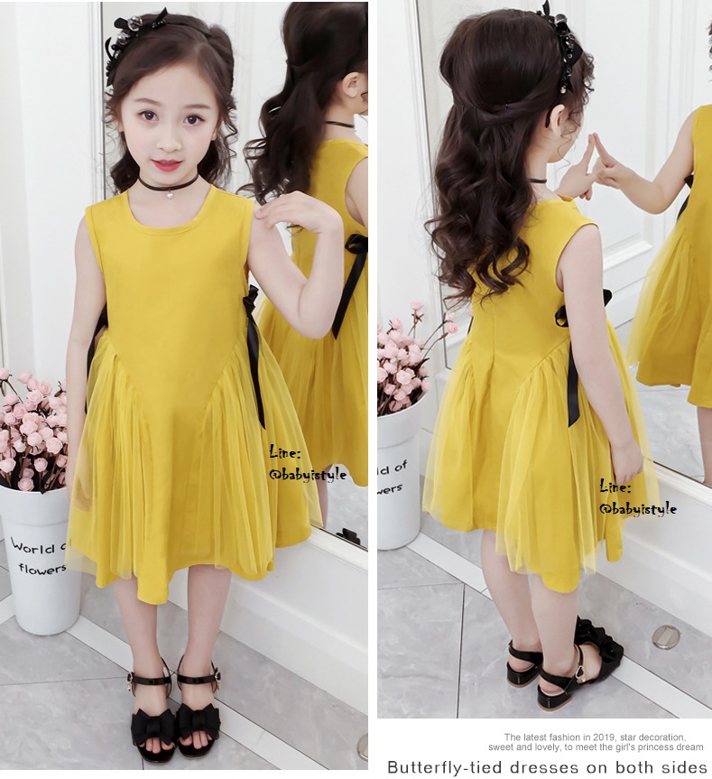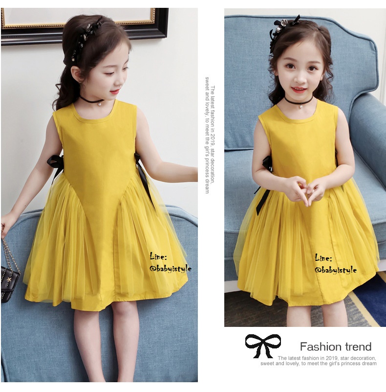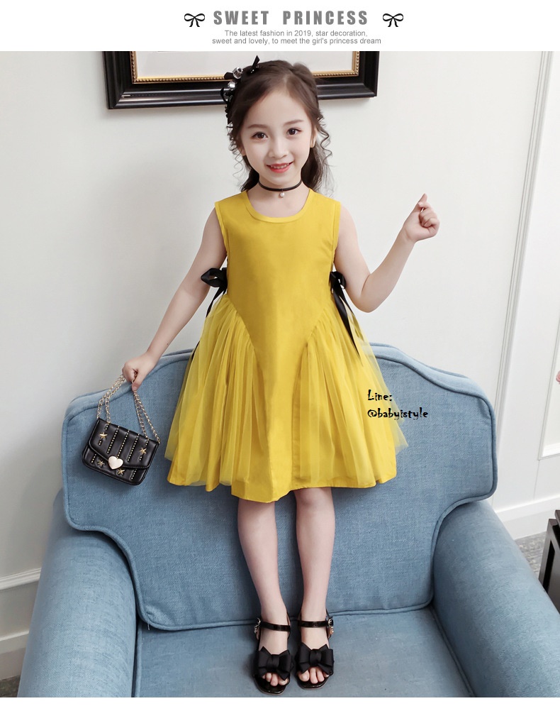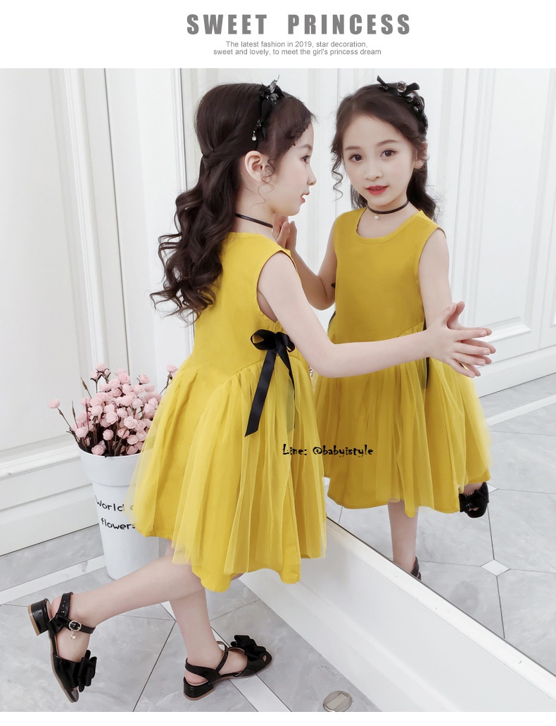 เด็กโต-เดรสแขนกุดทรงเอสีเหลืองมัสตาร์ด ด้านข้างแต่งผ้าโปร่งและริบบิ้นผูกโบว์สีดำ มีซิปหลัง ผ้าคอตตอน สวยเก๋ ไซส์ 140/150/160