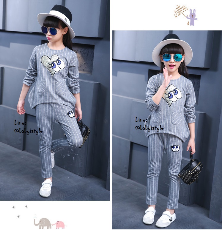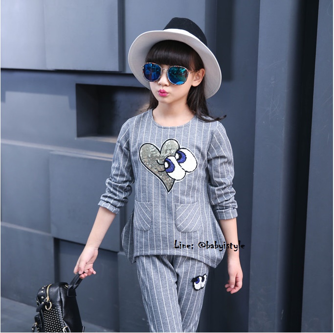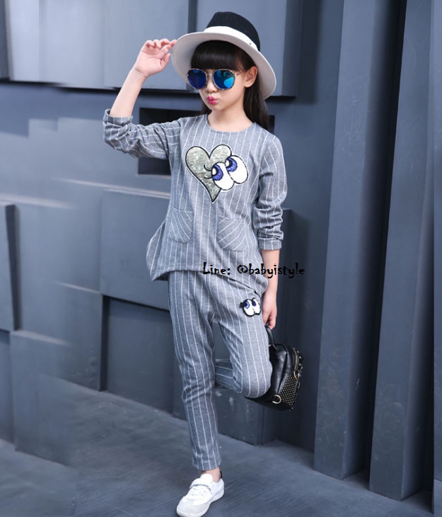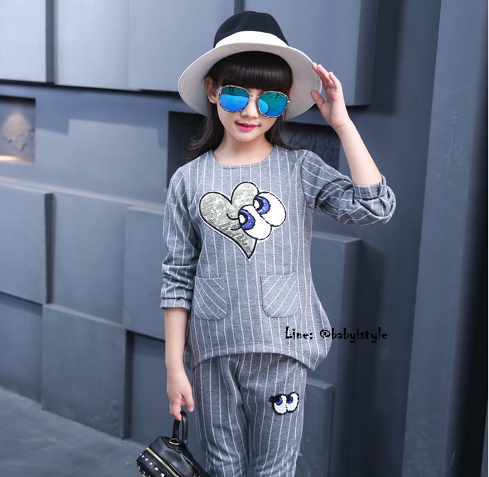เด็กโต-ชุด2ชิ้นเสื้อแขนยาวสีเทาลายริ้วติดเหลื่อมรูปหัวใจตาปิ๊งๆ มีกระเป๋าหน้า2ข้าง ชายเสื้อด้านหน้าโค้ง+กางเกงขายาวริ้วสีเทา เอวยางยืด ติดไหมพรมรูปตาโต ผ้าดีมาก งานสวยเว่อร์ ไซส์130/140/150