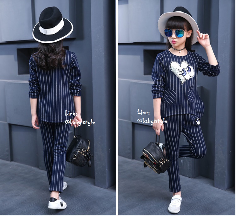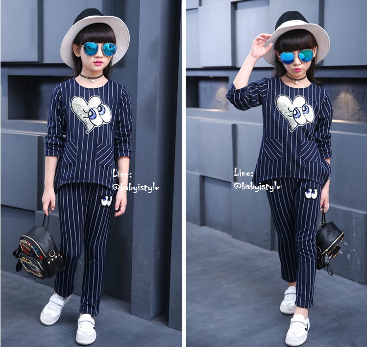 เด็กโต-ชุด2ชิ้นเสื้อแขนยาวสีกรมท่าลายริ้วติดเหลื่อมรูปหัวใจตาปิ๊งๆ