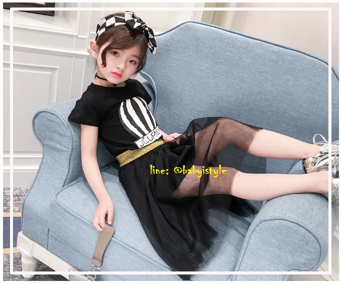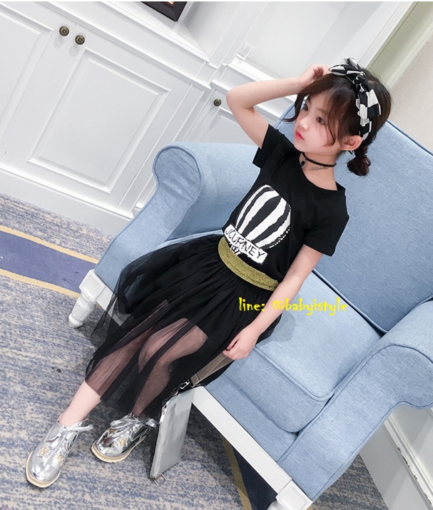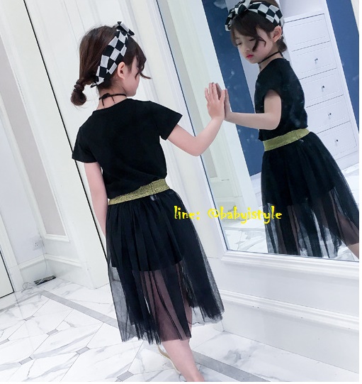 เด็กโต-ชุด2ชิ้นเดรสแขนสั้นสีดำ ลายบอลลูนJCURNEY+กระโปรงซีทรูผ้าโปร่งสีดำ เอวยางยืด งานสวยน่ารัก ไซส์130/140/150/160