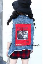 เด็กโต-เสื้อแจ็คเก็ตยีนส์แขนกุดด้านในซ้อนเสื้อสก็อตสีแดง ติดกระดุม หลังตัดปะ TOUR FEELINGS