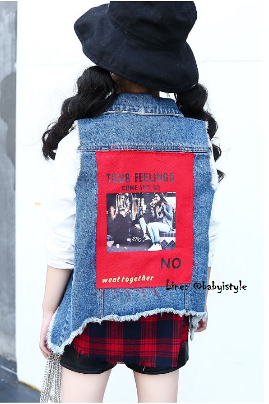 เด็กโต-เสื้อแจ็คเก็ตยีนส์แขนกุดด้านในซ้อนเสื้อสก็อตสีแดง ติดกระดุม หลังตัดปะ TOUR FEELINGS COME AND GO กระเป๋าหลอก ชายเสื้อแต่งรุ่ยๆ งานสวยเก๋เท่ห์ *ไม่มีกางเกง ไซส์ 140/150