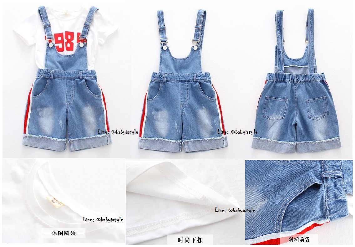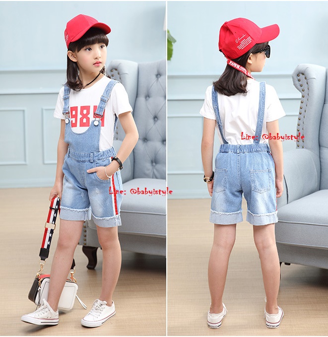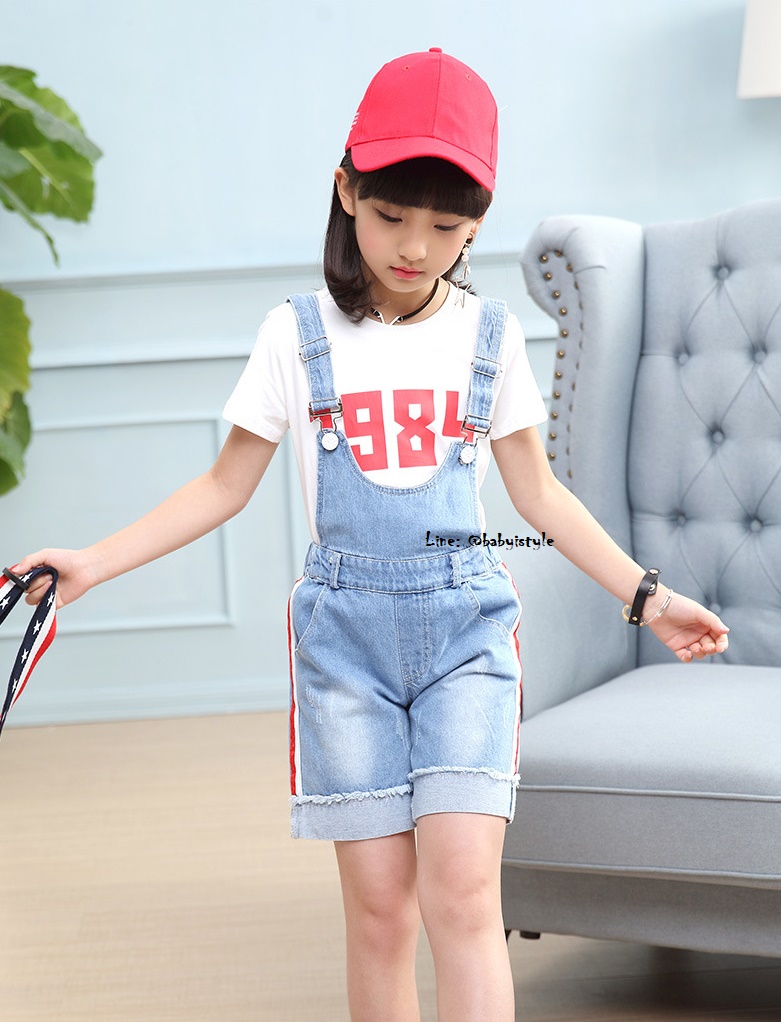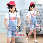 เด็กโต-ชุด2ชิ้นเสื้อคอกลมแขนสั้นสีขาวสกรีน 1984 ผ้ายืดหยุ่นได้+เอี๊ยมกางเกงขาสั้นพับเบิ้ลสียีนส์อ่อน มีกระเป๋าหน้า สายปรับระดับได้ งานสวยน่ารัก ไซส์140/150/160