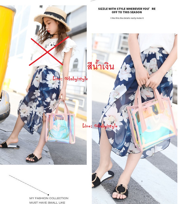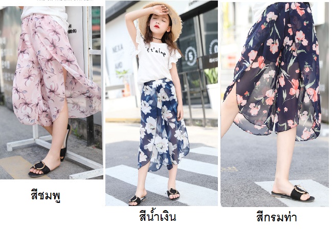 เด็กโต-กางเกงขายาวผ่าข้างสีน้ำเงินลายFlower มีซับในสั้น เอวยางยืด ผ้าพริ้วชีฟอง งานสวยน่ารัก ไซส์ 140/150/160