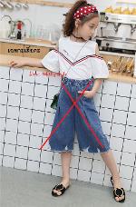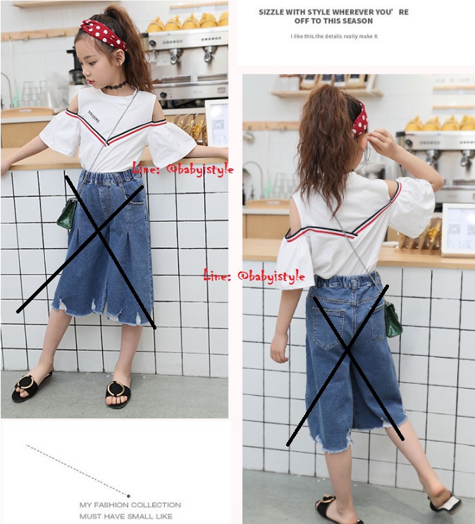 เด็กโต-เสื้อแขนเปิดไหล่สีขาวระบาย แต่งแถบริ้วสีดำ-แดง ปักNIESSINGเฉียงๆ ผ้ายืดหยุ่นได้ดี งานสวยคะ (ไม่รวมกางเกง)