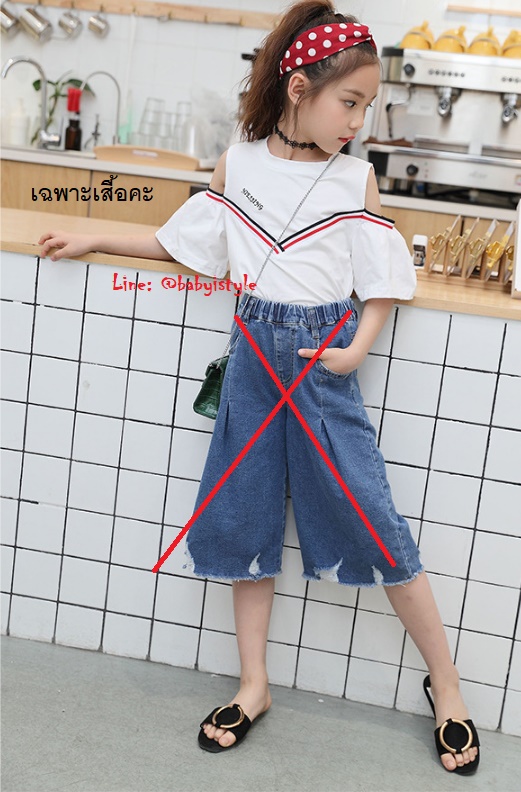 *Sales เด็กโต-เสื้อแขนเปิดไหล่สีขาวระบาย แต่งแถบริ้วสีดำ-แดง(ไม่รวมกางเกง)ไซส์ 160 รหัส KKK976A