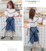 เด็กโต-เสื้อแขนเปิดไหล่สีขาวระบาย แต่งแถบริ้วสีดำ-แดง ปักNIESSINGเฉียงๆ ผ้ายืดหยุ่นได้ดี งานสวยคะ (ไม่รวมกางเกง) ไซส์ 140/150/160