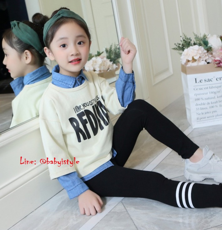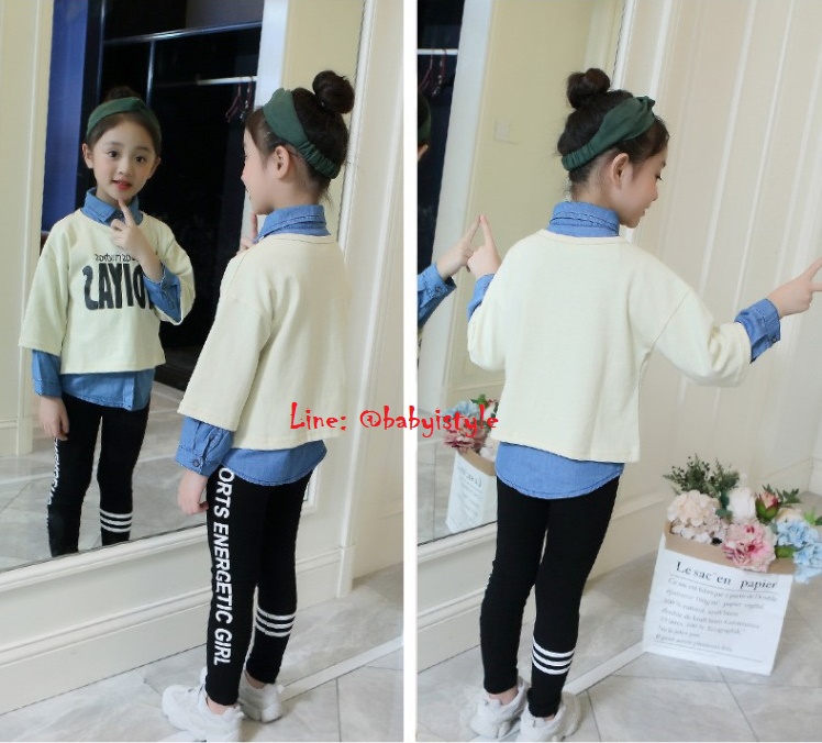เด็กโต-ชุด3ชิ้นเสื้อแขน3ส่วนสีครีมI like you as muchas RFDIYAS+เสื้อเชิ้ตยีนส์แขนยาวแบบบาง+เลกกิ้งขายาวสีดำสกรีนอักษร เอวยางยืด ผ้าดีมากๆ งานสวยน่ารัก ไซส์ 140/150/160