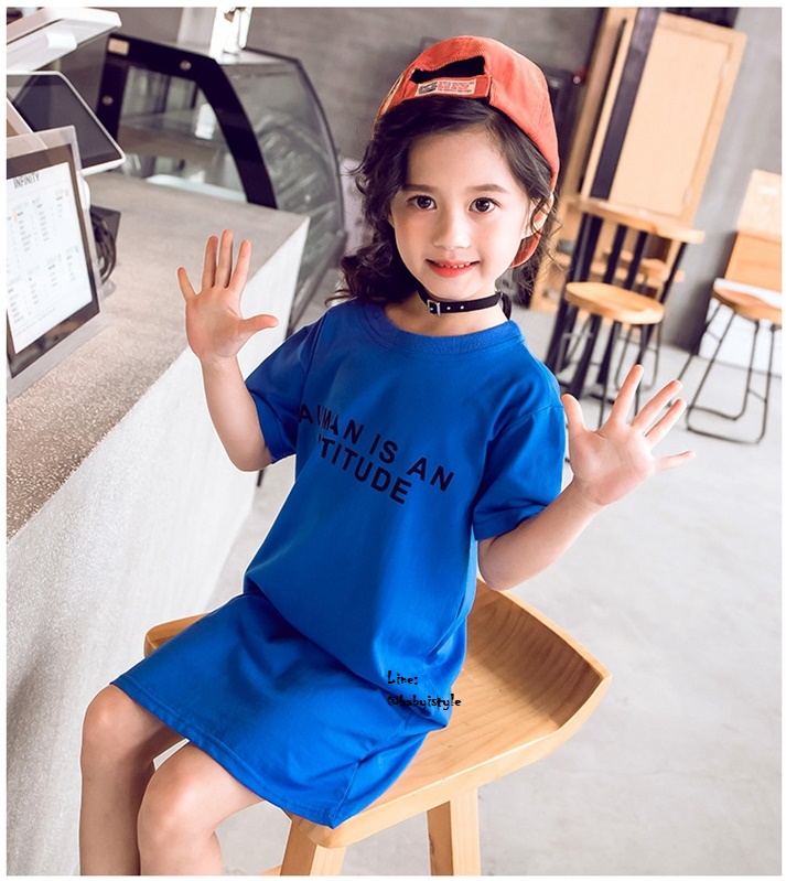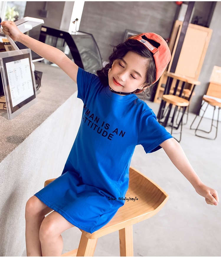 เด็กโต-เดรสแขนสั้นสีน้ำเงินสกรีน AUMAN IS AN ATTITUDE หลังเว้าหยดน้ำบิดเกรียว สวยเก๋ ไซส์ 140/150/160