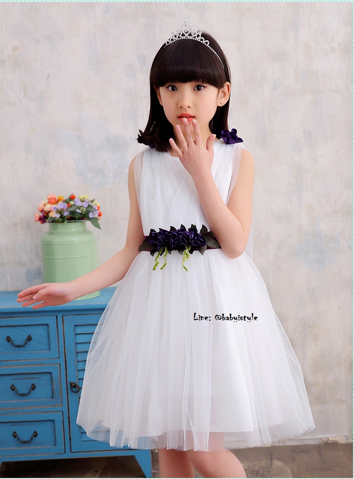 เด็กโต-เดรสออกงานแขนกุดสีขาว เอวแต่งดอกไม้สีม่วงผูกริบบิ้นหลัง  ราคา 590 พิเศษ 410 บาท*ไม่รวมค่าส่ง