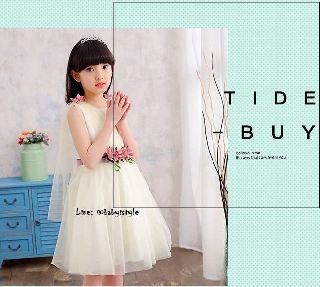 เด็กโต-เดรสออกงานแขนกุดสีครีม เอวแต่งดอกไม้สีชมพูผูกริบบิ้นหลัง บ่าแต่งดอกไม้และผ้าตาข่ายยาวกระโปรงฟูฟ่อง มีซับใน มีซิปหลัง งานสวยเริ่ดมากๆ ไซส์ 140/150/160