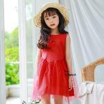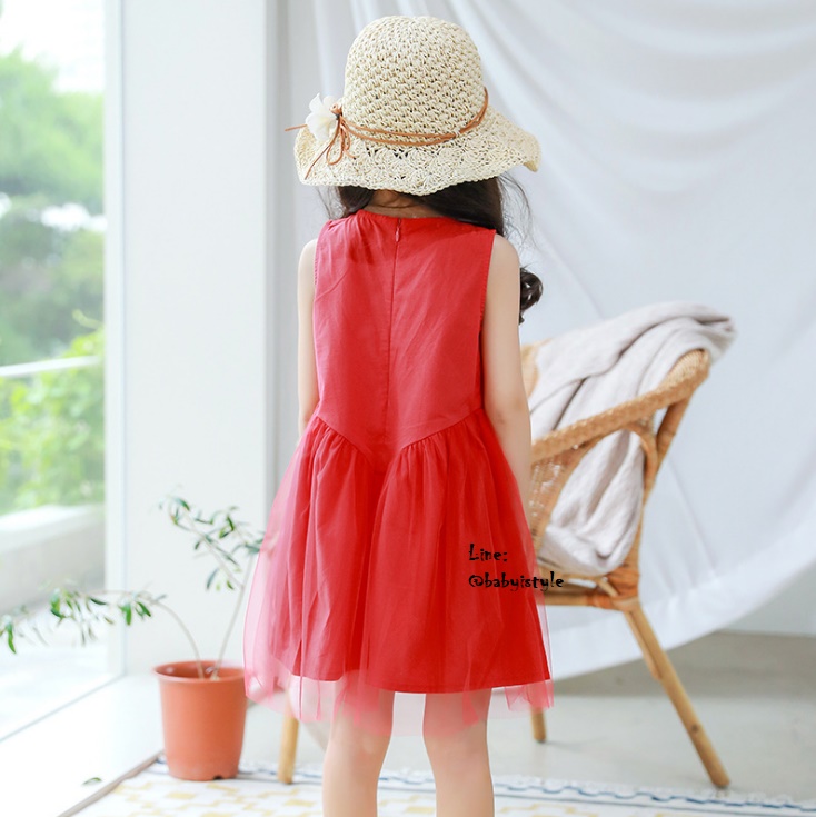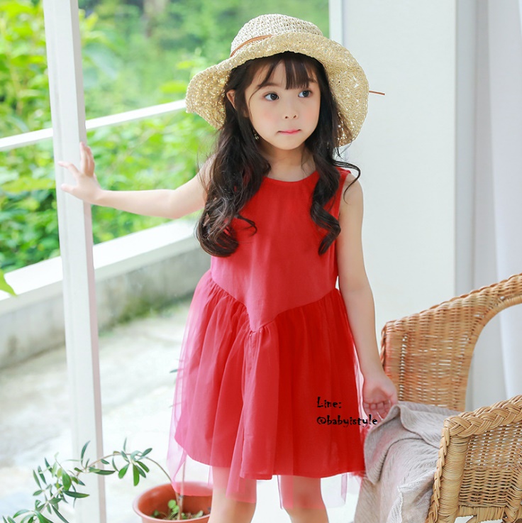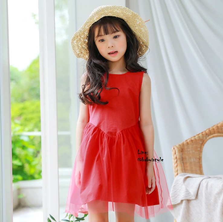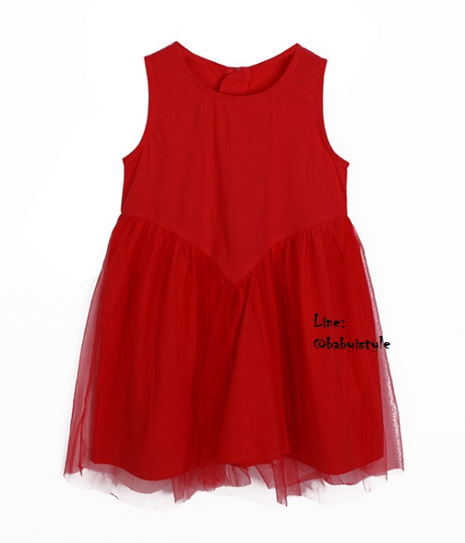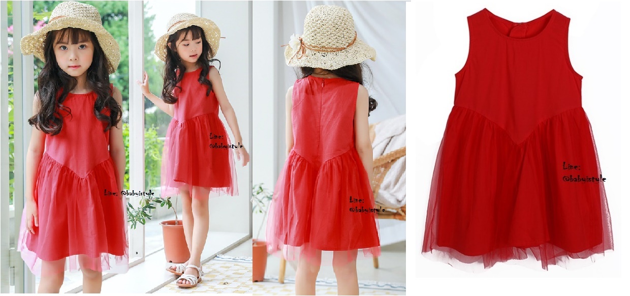 เด็กโต-เดรสพรีเมี่ยมแขนกุดสีแดง ซ้อนผ้าตาข่ายด้านนอกช่วงกระโปรง ผ้าคอตตอน มีซิปหลัง งานสวยน่ารัก