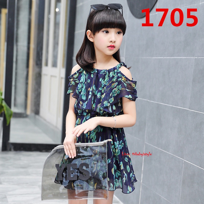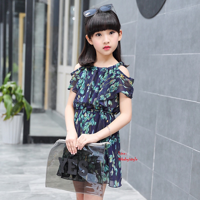 เด็กโต-เดรสเปิดไหล่สีกรมท่า ลายใบไม้ ช่วงเอวยางยืด มีซับในตั้งแต่ช่วงเอวลงมา ผ้าพริ้วสวยน่ารักมากๆ