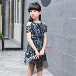 เด็กโต-เดรสเปิดไหล่สีกรมท่า ลายใบไม้ ช่วงเอวยางยืด มีซับในตั้งแต่ช่วงเอวลงมา ผ้าพริ้วสวยน่ารักมากๆ ไซส์ 140/150/160