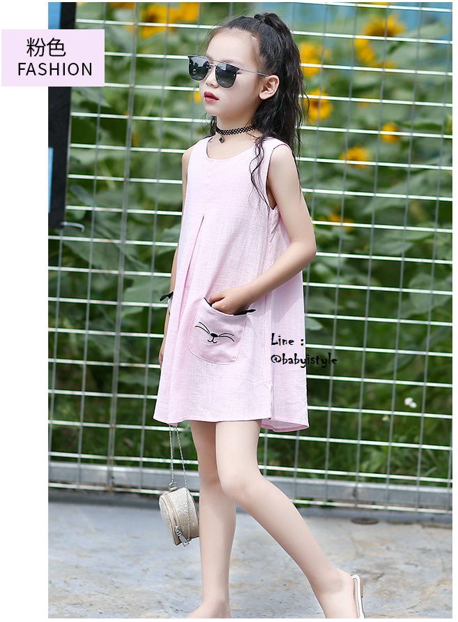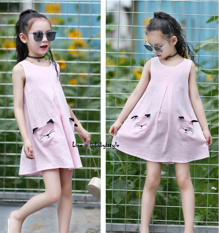 เด็กโต-เดรสแขนกุดสีชมพูทรงเอ มีกระเป๋าหน้าแมวเหมียว ติดกระดุมหลัง ผ้าลินินผสม งานสวยเริ่ด ไซส์ 140/150/160