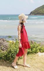 เด็กโต-เดรสสายเดี่ยวสีแดงเลือดนกผูกสายคล้องคอไปด้านหลัง ช่วงอกยางยืด หน้าสั้น หลังยาว งานสวยเซ็กซี่