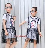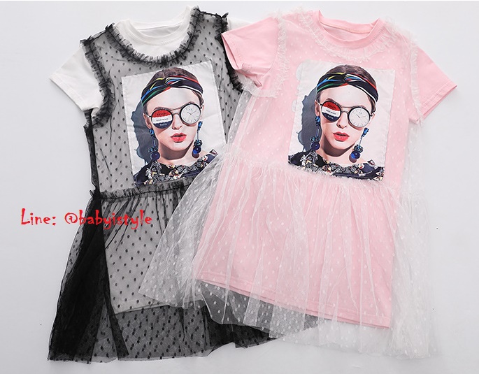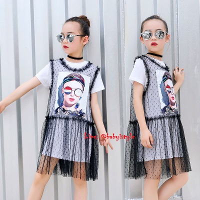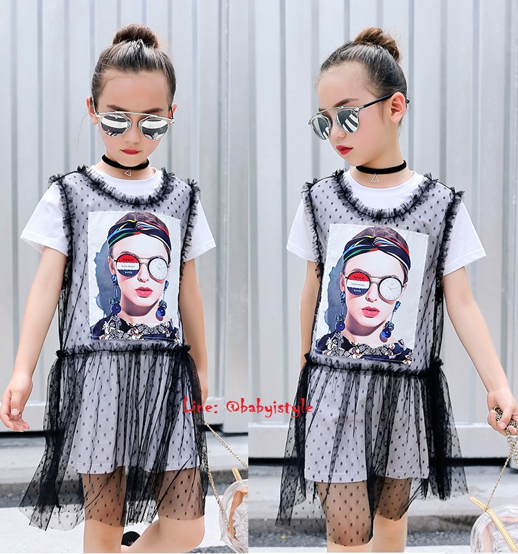 เด็กโต-ชุด2ชิ้นเดรสแขนสั้นสีขาวCOURAGE+เดรสผ้าตาข่ายสีดำปักรูปสาวเปรี้ยว งานสวยน่ารักชิคๆ ไซส์ 140/150/160
