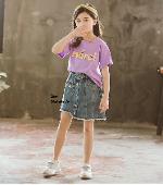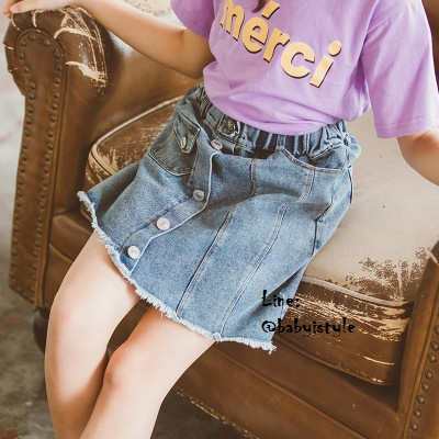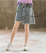 เด็กโต-กระโปรงสั้นยีนส์ฟอกชายเฉียงปล่อยๆ แต่งกระดุมหน้า เอวยางยืด มีกระเป๋าหน้า-หลัง งานสวยเก๋ (ไม่รวมเสื้อ) ไซส์ 140/150/160/170