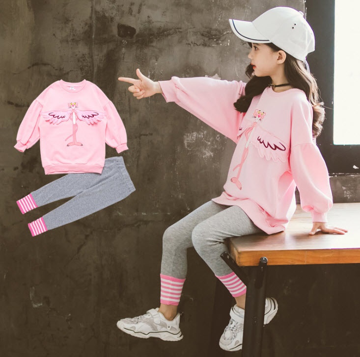 เด็กโต-ชุด2 ชิ้นเสื้อแขนยาวจั๊มพ์สีชมพู Pink Panther ปีก3D
