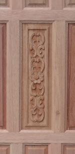 ผลิตจากไม้เต็งแดงอบ 70%ผสมกับไม้สยาหินแดง 30%ด้วยเอกลักษณ์ที่ไม้เอ็นตัวตั้งไม่ตรงกันทำให้เพิ่มเสน่ห์ประตูประกอบกับลายแกะที่ดูเรียบง่ายแต่ไม่เซาะกราว (ไม้เต็งแดง)