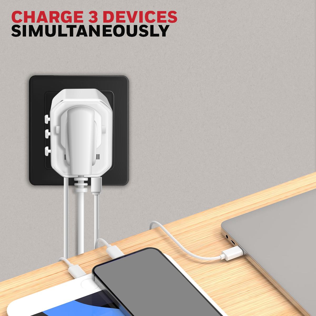 • สามารถชาร์จอุปกรณ์ 3 เครื่องพร้อมกัน ด้วย 1 ช่องจ่ายไฟแบบสากล 1 พอร์ต Type C และ 1 พอร์ต Type A