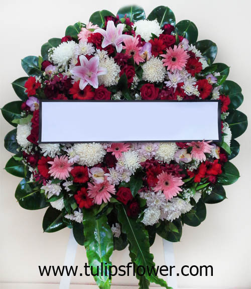 หรีดดอกไม้สด โทนสีขาวแดงชมพู