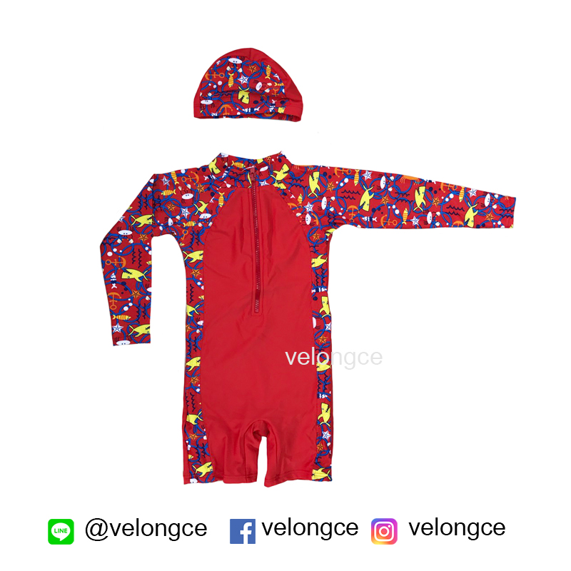 ชุดว่ายน้ำเด็ก ชิ้นเดียวแขนยาว ฟรี! แถมหมวกลายเดียวกับชุด