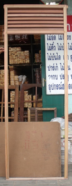 วงกบไม้เต็งแดง ด้านล่างสำหรับประตูขนาด 80x200ซม.ด้านบนเกล็ดไม้ติดตายกว้าง 80ซม.สูง 40ซม.โดยเกล็ดไม้ใช้ขนาด 4นิ้วซึ่งด้านบนสามารถผลิตสำหรับใส่กระจกได้อีกด้วย