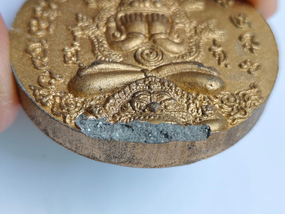 พระผงปิดตาพังพะกาฬ จตุคาม รามเทพ รุ่นสมบัติจักรพรรดิ์ ปี2549 เนื้อดำปัดบรอนซ์ทอง มีรอยกระเทาะ สภาพต