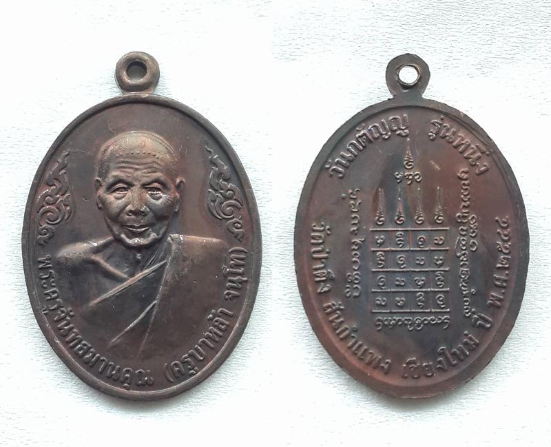 เหรียญพระครูจันทสมานคุณ หลวงปู่หล้า จันโท วันกตัญญู รุ่นหนึ่ง ครูบาหล้า วัดป่าตึง เชียงใหม่ ปี 2544