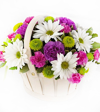 กระเช้าดอกไม้โทนสีชมพู คาร์เนชั่น กุหลาบ ดอกไรเซ็นทัส ดอกสต๊อก ดอกกุหลาบพวง ดอกแว็กและใบยูคากลม จัดในกระเช้าอย่างสวยงามค่ะ