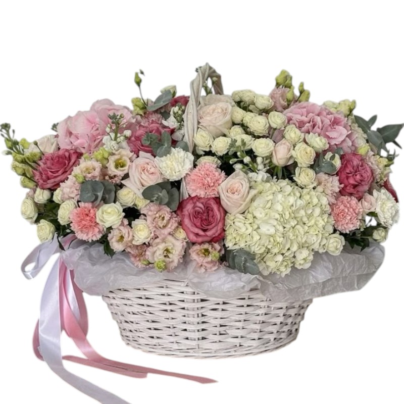 กระเช้าดอกไม้ มีดอกไฮเดรนเยียขาวชมพู ดอกกุหลาบ ดอกกุหลาบพวง ดอกคาร์เนชั่น ดอกสต๊อก ดอกไลเซ็นทัส ใบยูคากลม