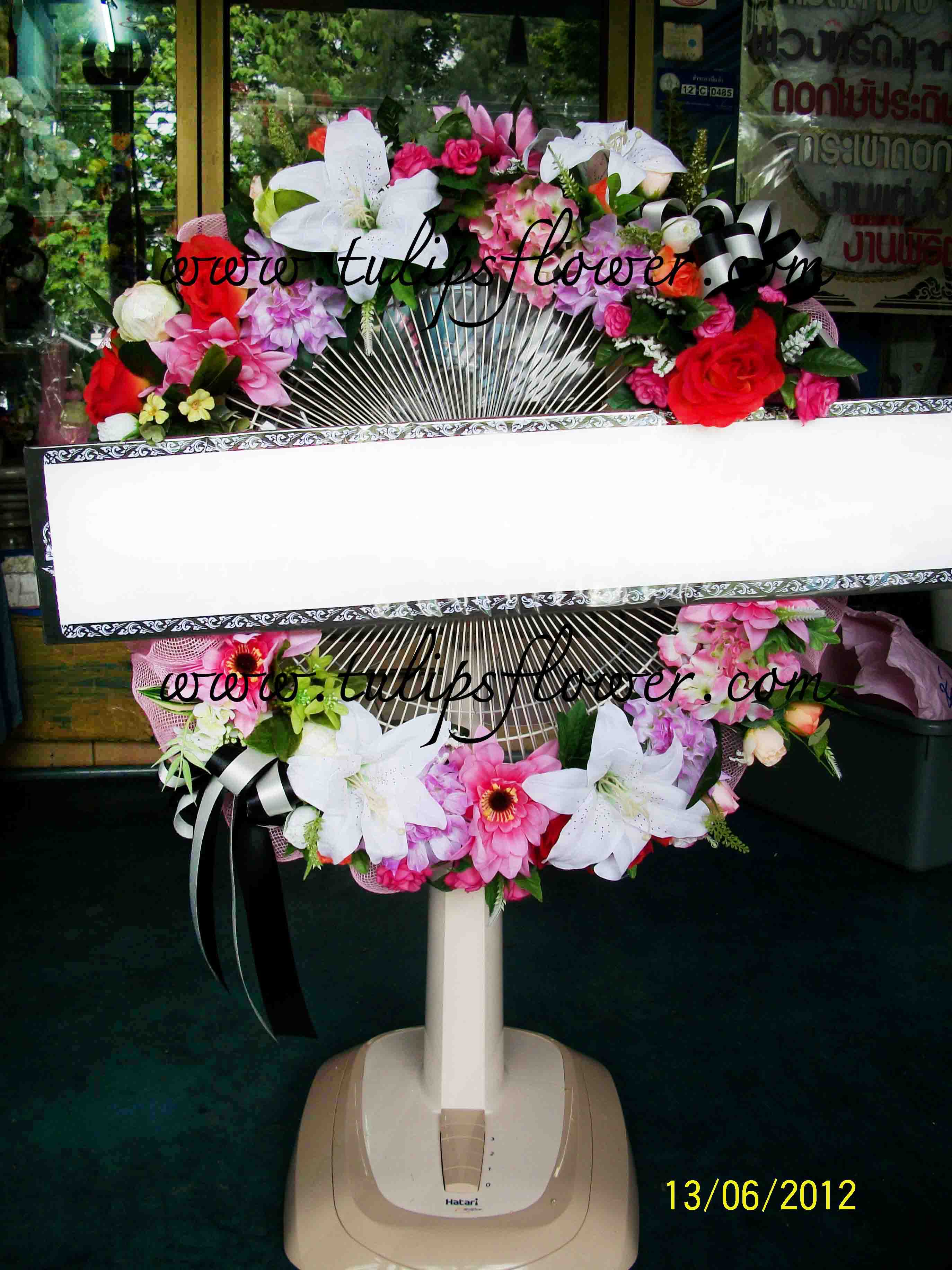 หรีดพัดลมแบบสไลด์ หน้ากว้าง 18 นิ้ว ของฮาตาริ(ดอกไม้สด สามารถปรับเปลียนสีได้ตามต้องการ)