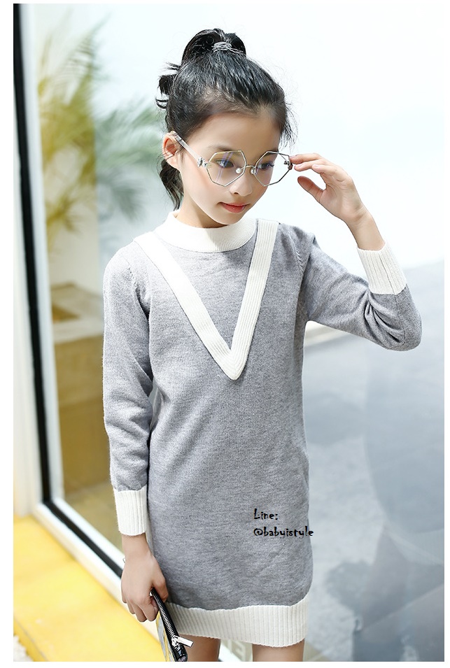 Sales เด็กโต-เดรสแขนยาวไหมพรมทรงสอบสีเทาแต่งตัวV ไซส์ 150 รหัส KKK799C