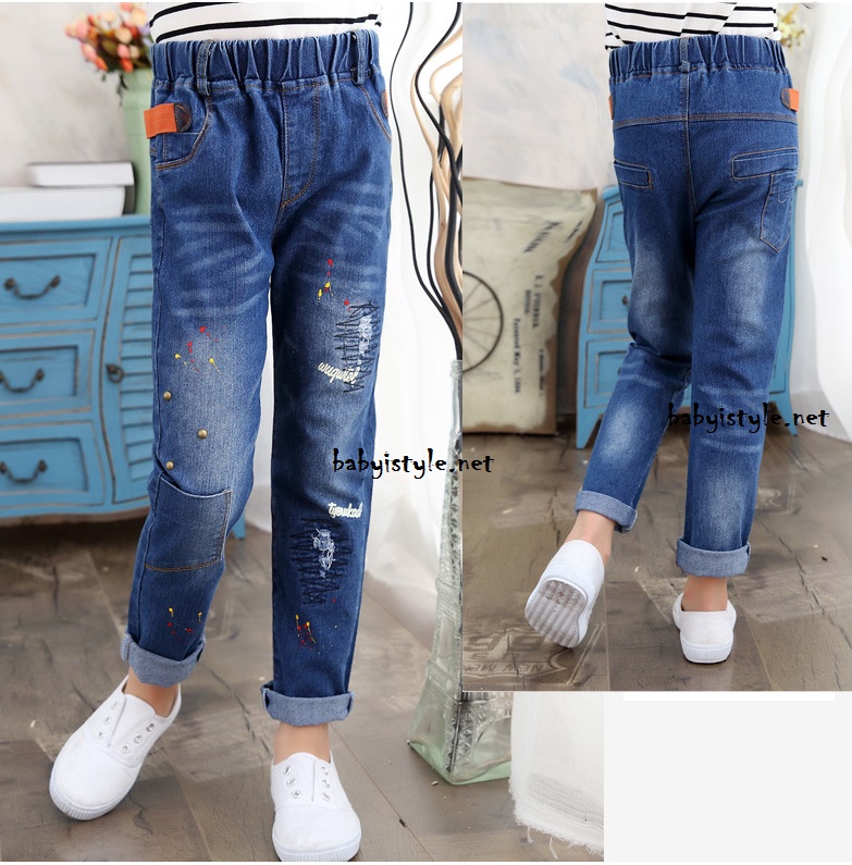 เด็กโต-กางเกงยีนส์ฟอกขายาวลายกราฟฟิคสี แต่งมุด เอวยางยืด ผ้านุ่มงานสวยเท่ห์ๆ ไซส์ 140/150/160