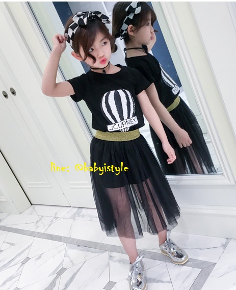 เด็กโต-ชุด2ชิ้นเดรสแขนสั้นสีดำ ลายบอลลูนJCURNEY+กระโปรงซีทรูผ้าโปร่งสีดำ เอวยางยืด งานสวยน่ารัก ไซส์130/140/150/160