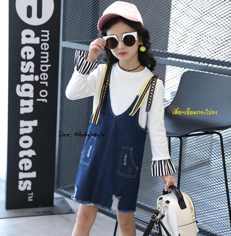 เด็กโต-เอี๊ยมกระโปรงยีนส์ แต่งขาดๆเซอร์ๆ สายเอี๊ยมซ้อน 2 แบบปรับได้ มีกระเป๋าหน้า-หลัง สวยเท่ห์ ไซส์ 150